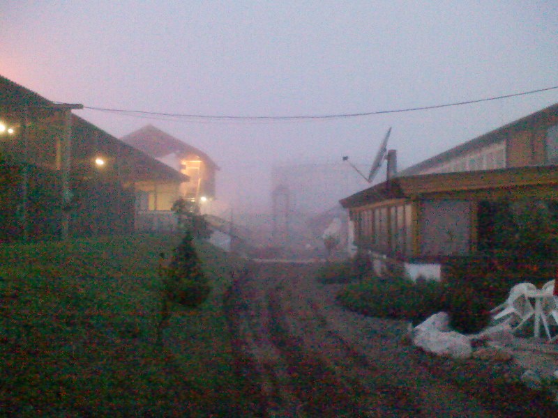 Morgennebel. Auf dem Weg zu den Sanitärcontainern.